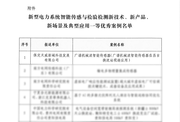 由天威新域自主研发的的广谱机械波智能传感器(广谱机械波智能传感器在昌吉换流站现场应用)凭借技术创新突破脱颖而出,获得“新型电力系统智能传感及检验检测新技术、新产品、新场景及典型应用优秀案例”一等奖。