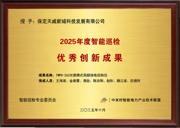 会议期间,发布2025年智能巡检技术应用与创新成果名单,天威新域“TWPD-2623E便携式局部放电巡检仪”通过专委会资料审查、专家初审、终审答辩等环节,获评“2025年智能巡检技术应用与创新成果”。