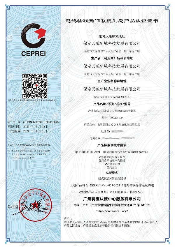 12月2日,保定天威新域科技发展有限公司自主研发的TWMG-100 固定式GIS局部放电在线监测装置,正式通过南方电网电鸿物联操作系统生态产品认证,成为实现"硬件+操作系统+应用软件"国产化的监测装备。这一突破标志着我国电力设备状态监测技术摆脱对国外基础软件的依赖,为新型电力系统建设提供了自主可控的方案。