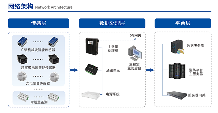 系统采用分布式架构设计,大幅降低了系统的安装与维护成本,同时显著提升了系统的可靠性,其专用数据服务器作为整个系统的“大脑”,负责管理所有智能传感器(广谱机械波智能传感器、宽带电流智能传感器、特高频智能传感器等),实现高速同步协调工作,并可直接接入油气监测装置以及常规量(电压、电流、温度)等设备。系统具备自校验功能,确保了监测数据的有效性和准确性,同时具有高度的可维护性,能够在变压器正常运行状态下快速完成安装,并可长期稳定运行。